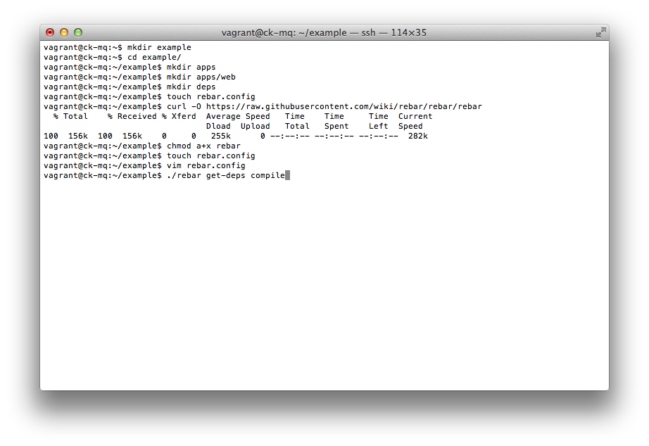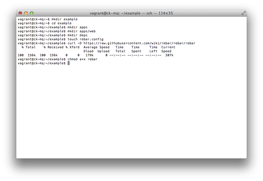 mkdir example # create directory for project cd example mkdir apps # apps directory will contain our applications mkdir apps/web # 'web' is the name of our application mkdir deps # deps directory will be used for saving dependent libraries touch rebar.config # rebar config curl -O https://raw.githubusercontent.com/wiki/rebar/rebar/rebar # download rebar chmod a+x rebar # make rebar executable