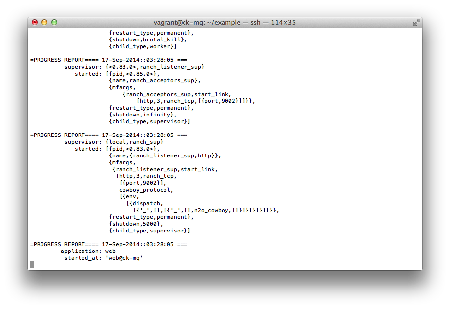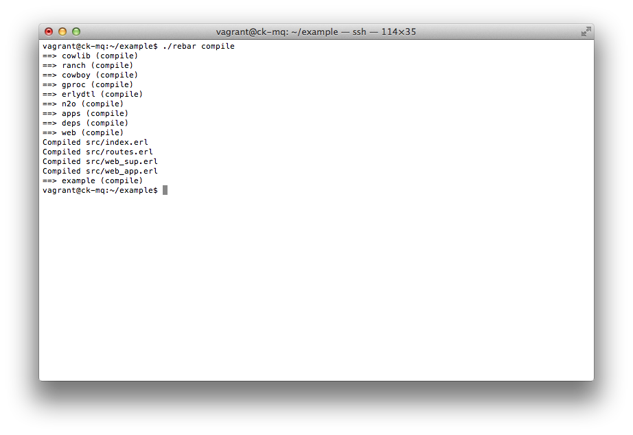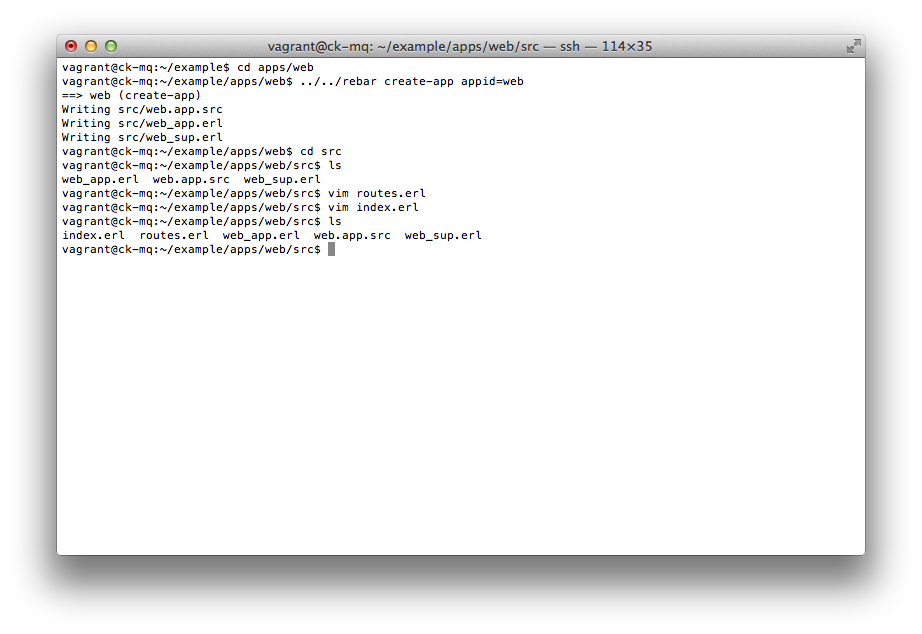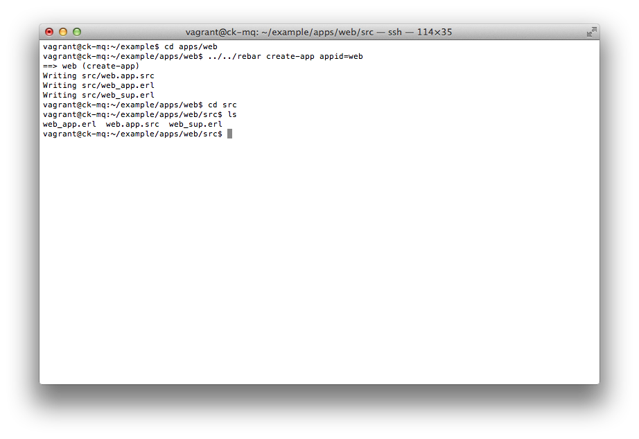 Done. Now let's use some rebar magic and generate our first Erlang/OTP application in 'apps/web' directory.