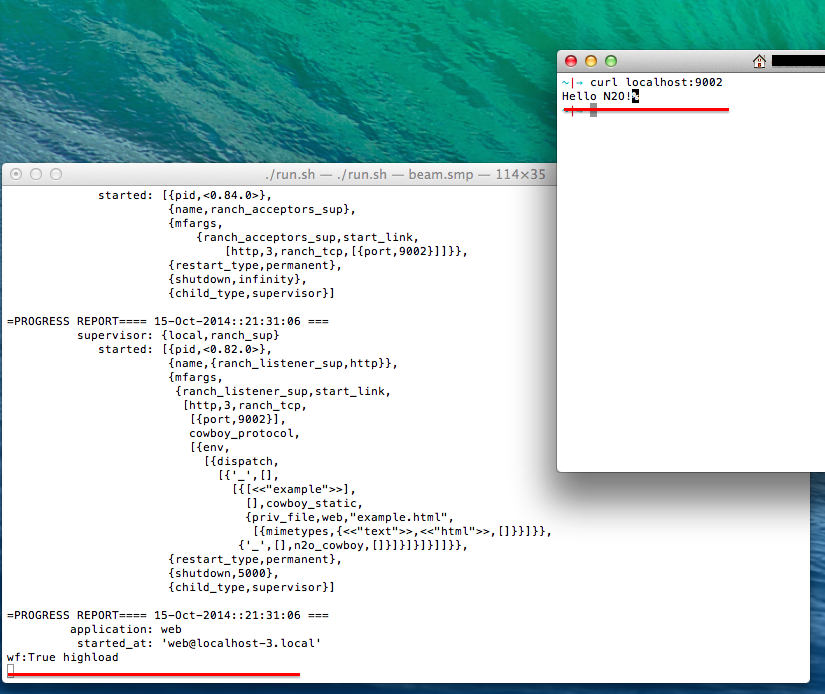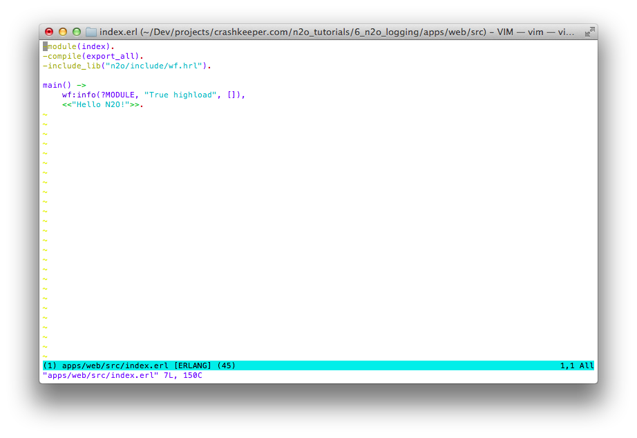 Configuration is ready. Now we will add logs to the index.erl file and every time when we call "/" url, N2O will write in console "True highload".